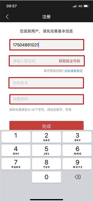 第二步:输入手机号,点击获取验证码,输入验证码、姓名,设置好密码后,点击完成按钮即可登录;