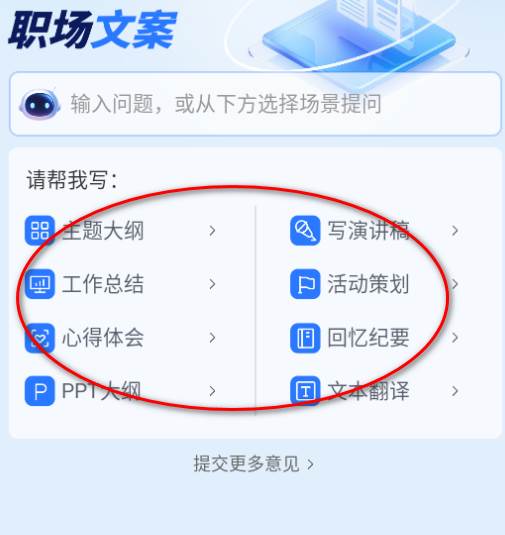 职场文案生成:用户可以快速生成工作总结、演讲稿和主题大纲等职场文档,提高工作效率。