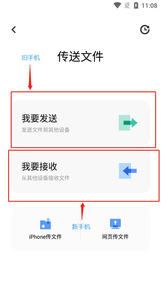2、两台手机分别打开 APP,选择底部一键换机,备份用的手机点击我是新手机,进入扫码窗口,另一手机点击我是旧手机,生成二维码。