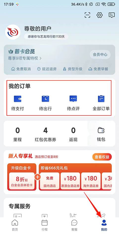 1、打开艺龙旅行APP,点击我的-我的订单;