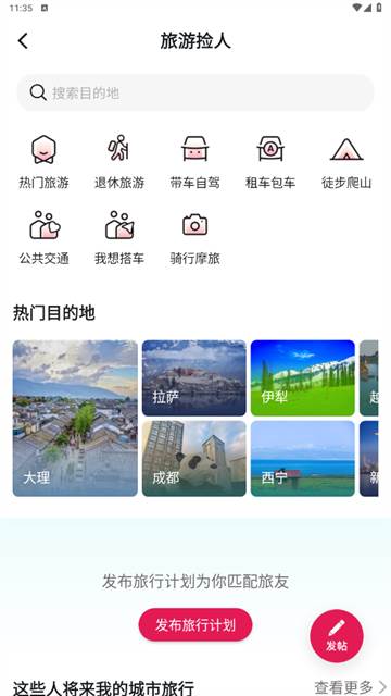 搜索你的目的地,匹配合适的旅友,发布旅行计划,寻觅与你志同道合的搭子。
