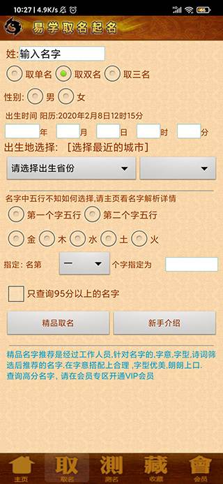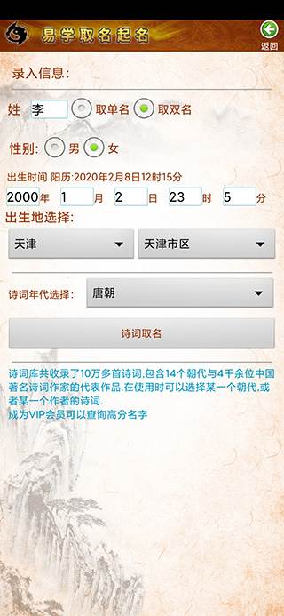 周易生辰八字取名起名是一款不用联网宝宝取名软件,它根据周易理论,应用五行、八字、五格三才,剖象,灵动等因素为您宝宝取名起,同时它也是支持诗词取名的宝宝取名软件。