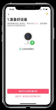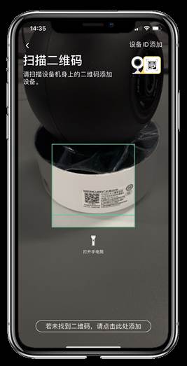 1.登录APP后,摄像机在出厂状态下上电后红绿灯交替闪烁,在APP上点击设备主界面右上角的“+”,扫描无线网络摄像机机身上的二维码,如下图: