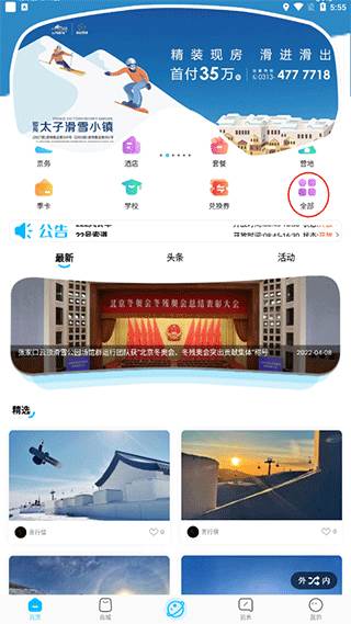 1、进入云顶滑雪公园APP,账号成功后,进入首页,点击上方的全部进入。