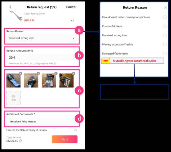 拒绝退货–如果您的退货请求中没有足够的证据或索赔不合理,卖家可以拒绝您的退货申请。当您的返回被拒绝时,您可以与Lazada进行争执,以寻求解决方案。
