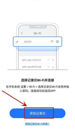 3、在手机设置中打开WiFi并选择记录仪的WiFi名称,连接成功后可以在app内进行添加。