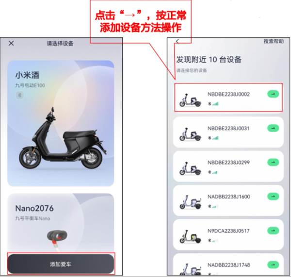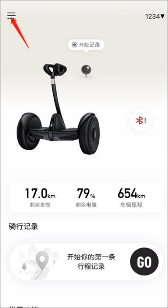 首先车辆连接九号出行app后,点击设备主页面左上角按钮,然后点击添加爱车,进行车辆添加即可。