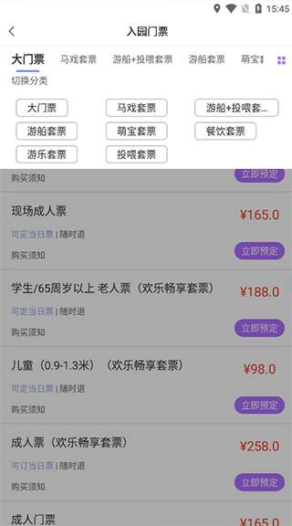 3、入园门票可根据自己的需求来购票,分为了大门票,马戏套票,游船套票,游乐套票,投喂套票等。