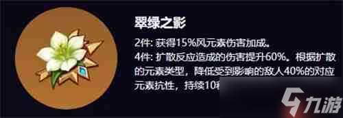 1、翠绿之影4件(泛用型减抗流)适用于水/火/冰/雷队,提供40%风元素伤害加成 + 降低敌方对应元素抗性20%,配合雅珂达战技扩元素范围与大招聚怪,显著提升主C蒸发、融化、感电等反应输出效率。
