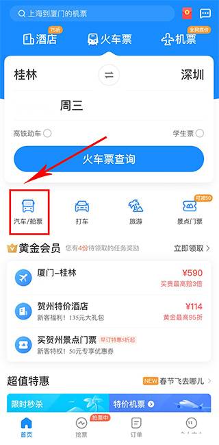 1、点击首页“汽车/船票”选项。