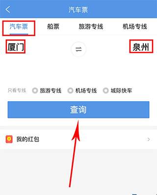 2、点击汽车票,填上出发站和到达站,再点开日期选择你要预订汽车票的出发日期,填好这些信息后点击查询。