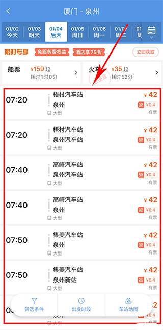 3、点开后就会出现你的行程汽车车次情况,可以选择不同时间、不同车站的车票,点击你要预订的汽车票,只要有票的,都是可以预订的。