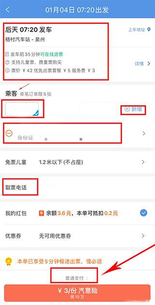 5、填写好乘客信息,包括姓名、身份证号、手机号码,再填写好取票电话,检查完所有车次信息和乘客信息无误后,点击普通支付或根据个人需要选择汽车险。