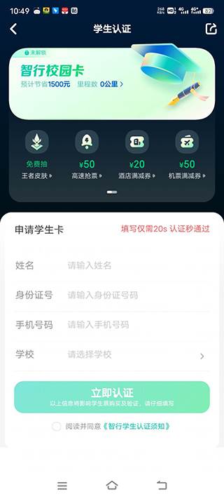 进入学生认证页面后,输入学生的学校信息以及身份信息,点击立即认证。