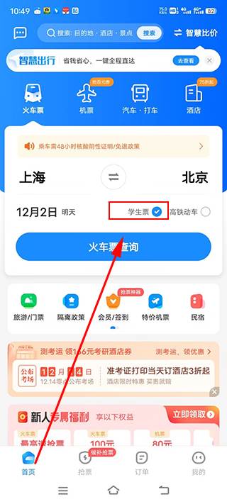 认证学生信息成功后,回到主页面,勾选学生票选项后即可进项购买学生票。