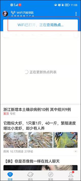 2、在开启wifi开关后,会自动搜索并显示出当前有的wifi,启动数据连接,点击WIFI万能钥匙下面钥匙样式的按钮,这时候软件就会自动联网获取密码。