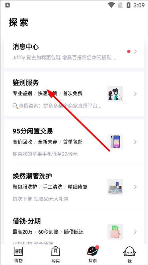 1、从软件主界面【得物】切换到【探索】界面,这里显示了鉴别服务、95分闲置交易、焕然潮奢洗护、借钱。分期等功能,选择“鉴别服务”功能。