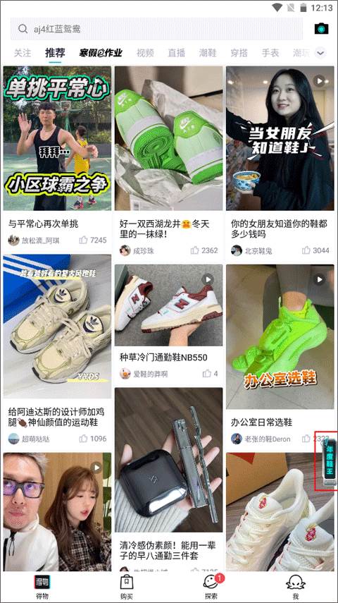 1、打开软件并进入主界面【得物】,app默认为“推荐”板块,在这里你会看到很多的选鞋搭配技巧,以及各种穿搭攻略,如果你对哪个博主发布的视频比较青睐的话,还可以点赞关注他/她。点击右下方的“年度鞋王”按钮。