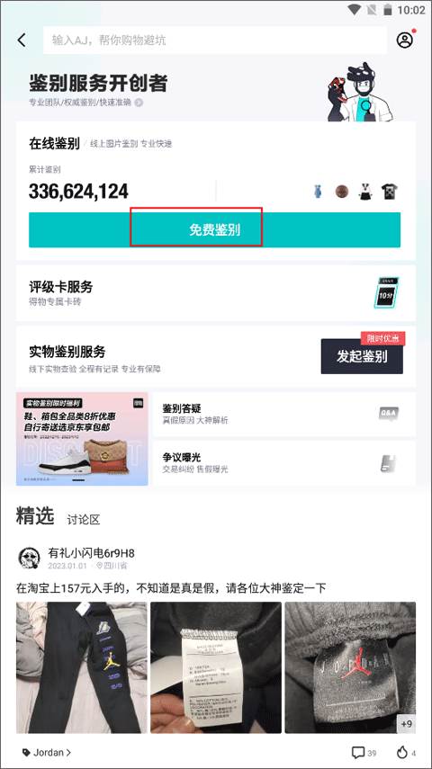 2、你可以选择在线鉴别,也可以发起实物鉴别服务,同样也能在讨论区中发布自己的鉴别帖子进行讨论,点击上方的“免费鉴别”按钮。