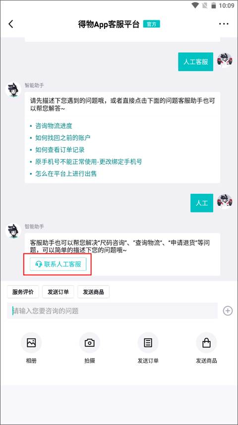 3、这时页面上会有一个智能助手自动回复信息,如果想转到人工客服,需要在输入框中输入关键词“人工”就可以了。