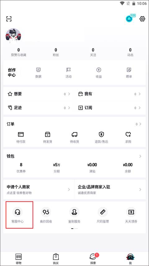 4、打开我的页面,我的页面可以查看订单、足迹、订阅、钱包、创作中心等,点击想要进入页面;