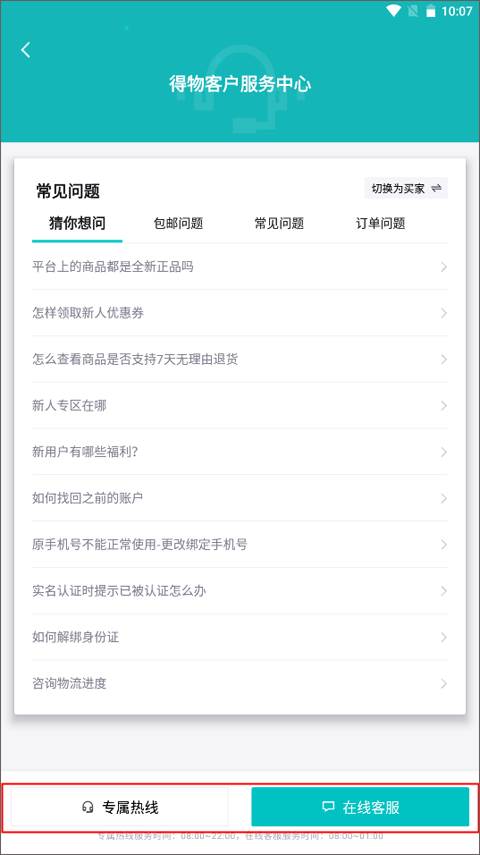 2、进入到得物客户服务中心界面之后,下方有两种方式可以联系人工客服:专属热线、在线客服,选择“在线客服”。