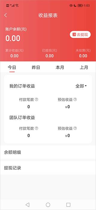 2、在这里就能查看收益了,大家可以点击“余额明细”和“提现记录”来进一步了解这些记录。