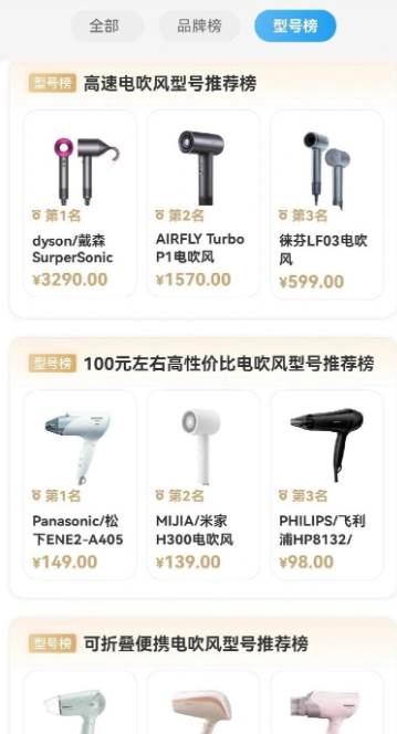 4、在型号榜中,盖得排行会根据同类产品主打的不同功能而进行排行。以吹风机为例,型号榜根据性能、价格等因素做了详细的划分。