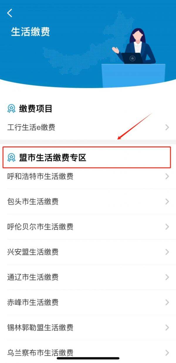 3、进入“生活缴费”页面后,在“盟市生活缴费专区”下选择所在盟市的生活缴费服务点击进入。