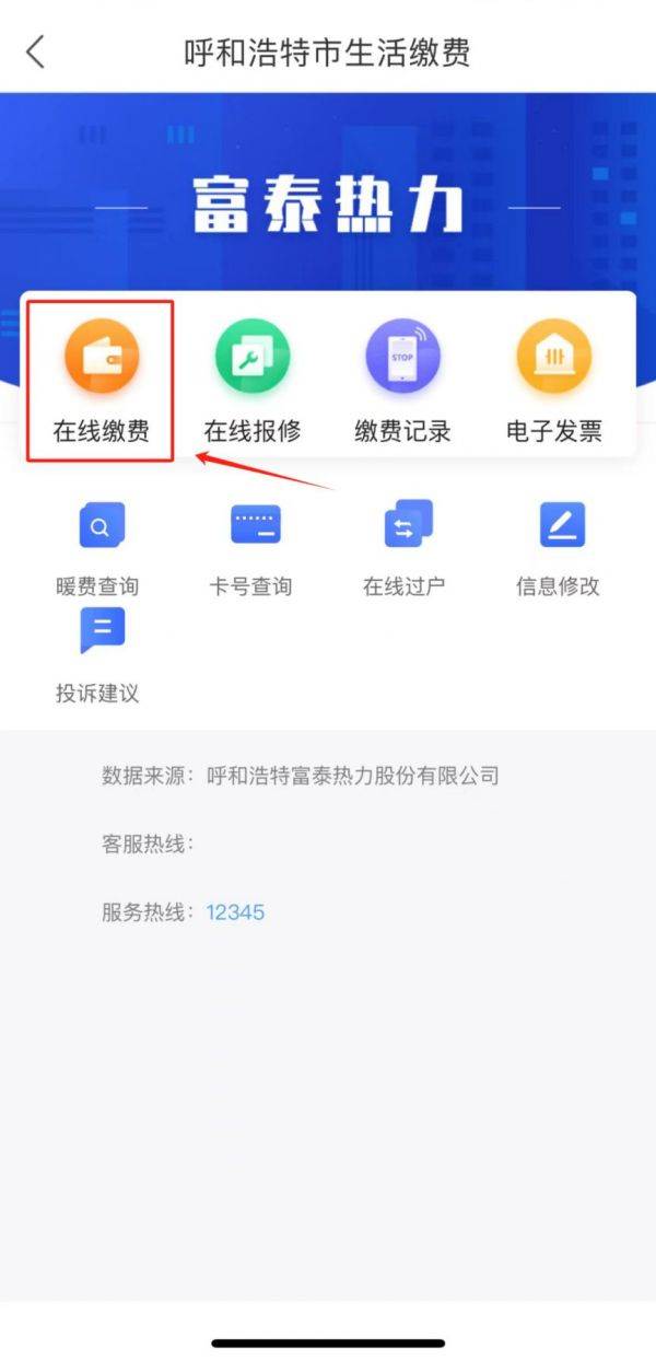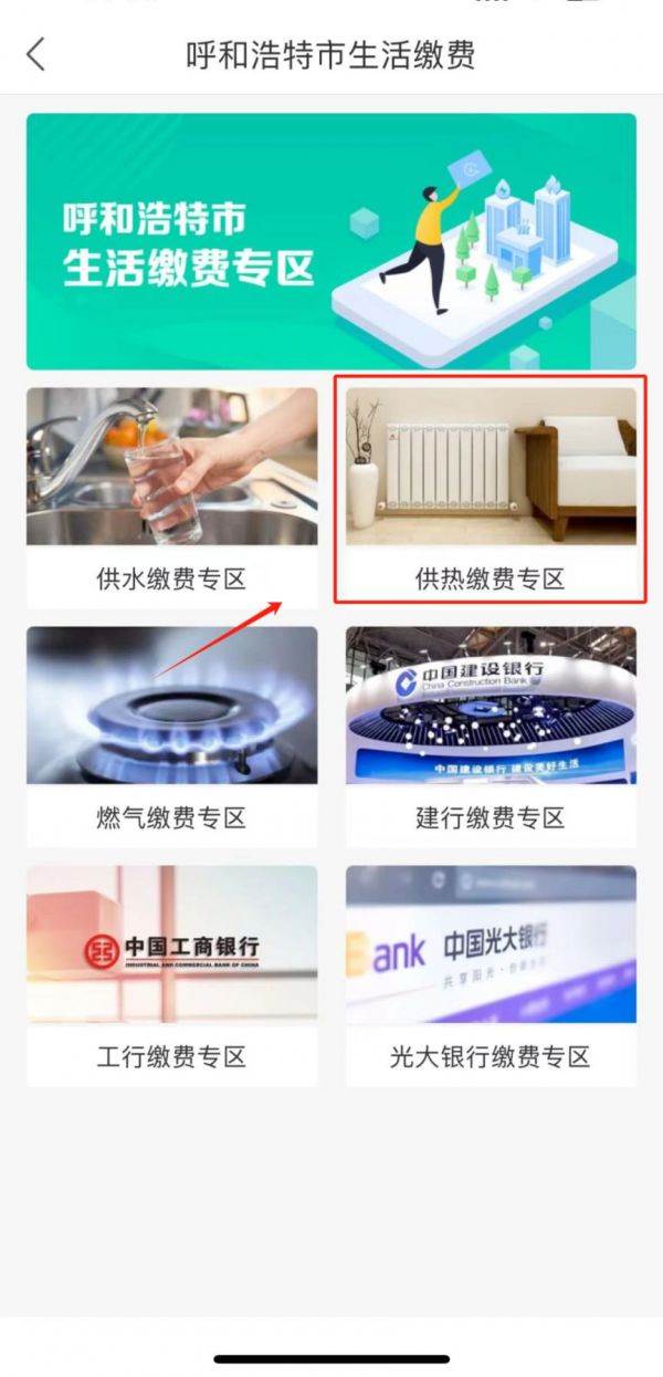 5、以呼和浩特市为例,按照页面提示在“供热缴费专区”选择您需要办理的供热服务,根据提示操作即可。