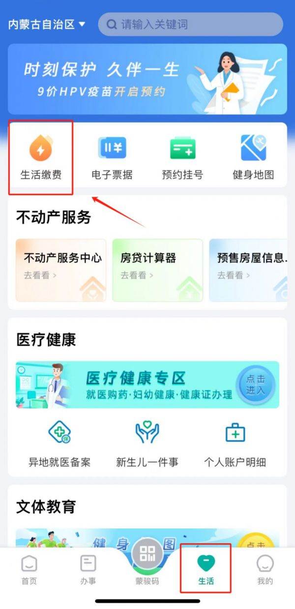 1、下载并登录“蒙速办”APP,在首页找到并点击“生活”页面。