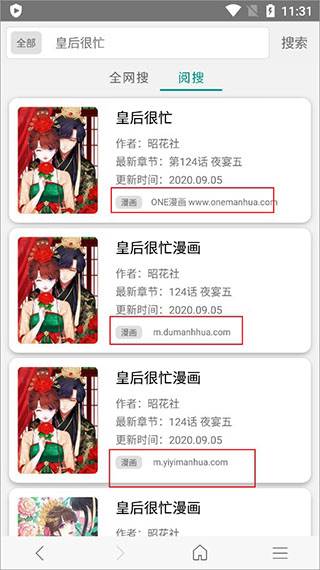 1、用过阅站的朋友都知道,以前是可以用阅搜来搜索漫画的,但是新版本却变成了浏览器搜索!而且默认模式网页看漫画很难受,所以今天教大家把默认阅读模式换掉。