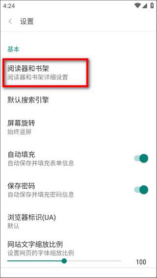 4、点击“阅读器和书架”。