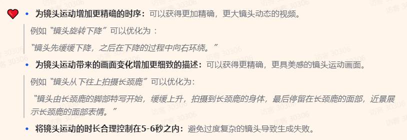 图生视频使用的图片作为视频的首帧出现,限定了视频的主体物形象和基本画面美学风格,因此相比文生视频Prompt,图生视频Prompt可以适当地减少信息量。