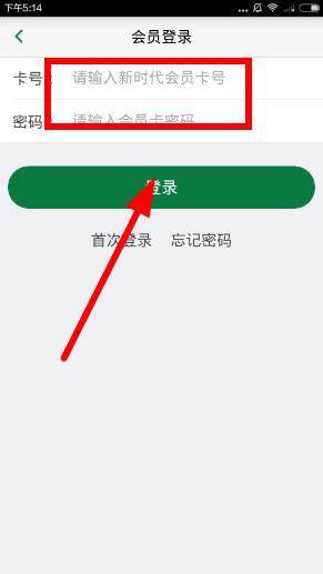 2、在登录界面,输入新时代会员卡号,以及会员卡密码,点击登录按钮就可以的哟,如果是首次登录点击首次登录按钮,