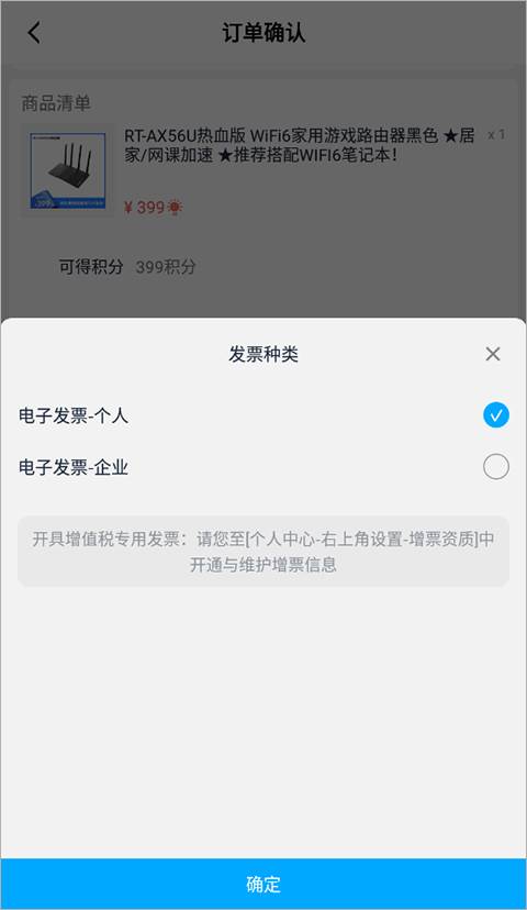 1、在订单确认界面点击“添加发票”一栏。