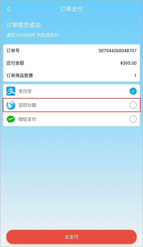 2、接着在付款界面选择“花呗分期”即可分期付款了。