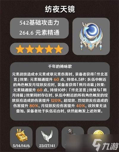 圣遗物推荐:纺月的夜歌,主词条:精通、精通、双爆,副词条:双爆、精通、充能