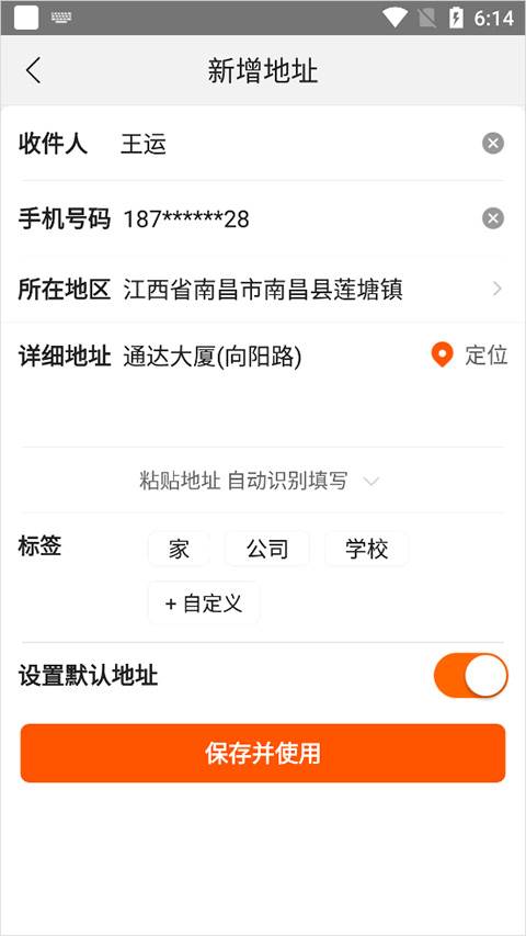 填写收货地址时,需要填写收件人姓名,手机号一般就是登录时的手机号,地址可以通过定们进行获取,填写上述信息后,可以开启设置默认地址,将该地址设为默认,下次购物时就可直接使用该地址了,不用重新填写了。填写成功后,点击下方【保存并使用】