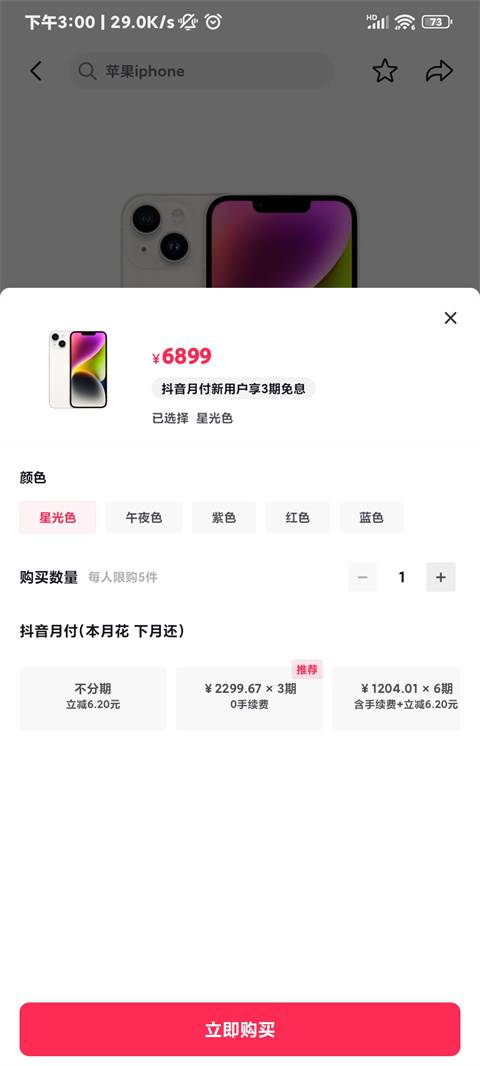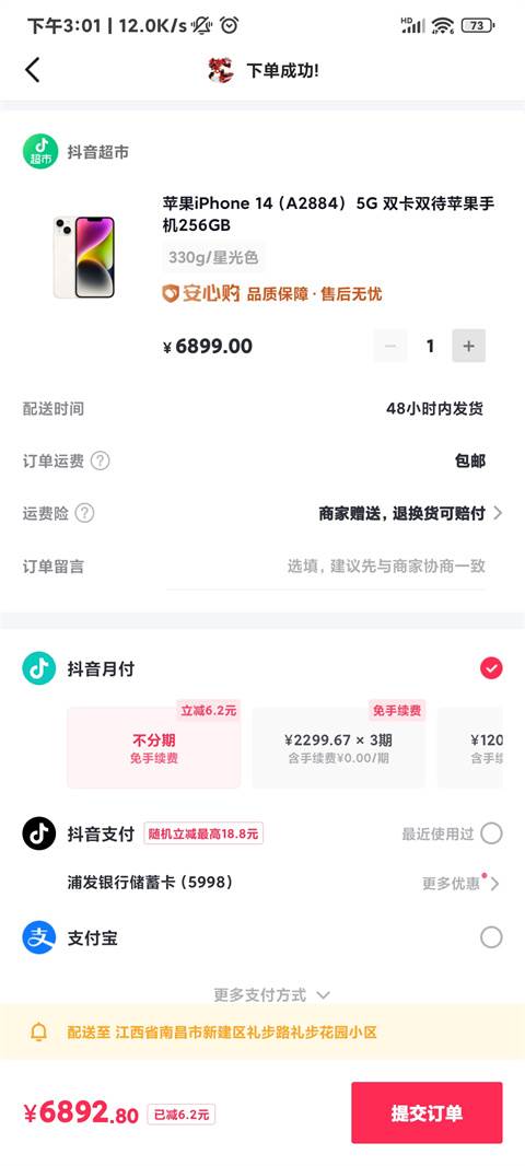 5、进入购买页面可以看到所有商品都是四十八小时内发货,并且是保障运费险的,而且还支持大家使用抖音支付、抖音月付、微信、支付宝等多种支付方式,您可以放心购买。