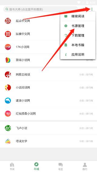 4、当然我们可以点击搜索框后的“⋮”,然后在弹出的功能中找到“书源管理”并点击。