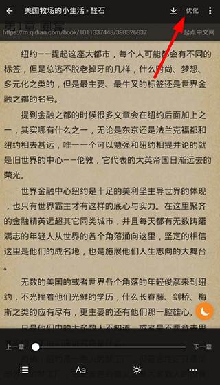 1、大家想要设置修改小说的翻页方式,那么就需要找到自己感兴趣的小说,点击进入小说的阅读页面里,选择右上角“优化”按钮进行设置。