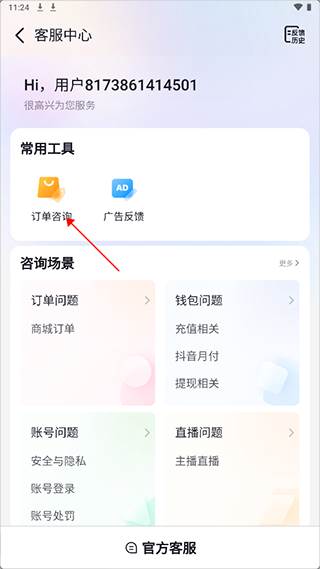 用户可以在抖音商城app(即抖音商城版app)【我的】页面下点击上面的类似“三”的图标,然后点击【我的客服】