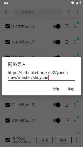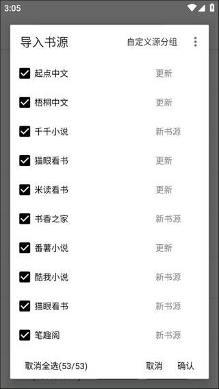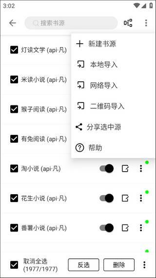 4、全选打勾之后就算启用书源了,如果还想导入网络大神的书源可以点击右上角的按钮