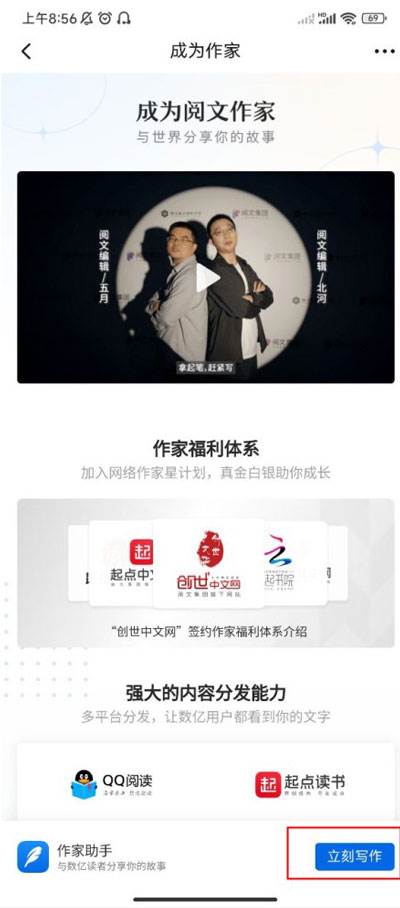 1、首先在手机上打开起点读书app,点击底部我——找到成为作家