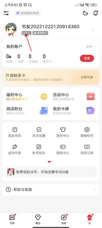 3、最后,进入福利中心页面,找到任务区域,点击看视频按钮,通过看视频,获取免费章节卡,就可以免费阅读章节内容。