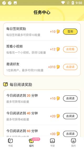 2、完成“福利”页面相对应的任务,即可免费领取能量用于游戏当中