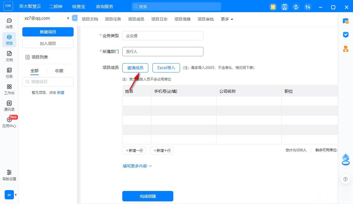 如何添加项目成员:项目创建完毕后,可以通过输入成员信息或通过excel导入成员的方式将其他成员添加至项目组内进行协同工作。