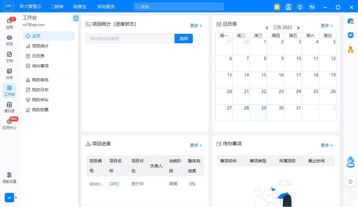 如何查看项目统计和任务:在工作台界面,可以查看项目统计、日历表、待办事项、我的审批、我的日志、我的会议、我的投票等信息。项目相关的任务也可以在软件中查看。