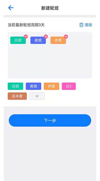 2、设置最小轮班周期,如两班倒可以选择白班、夜班、休息。如有需要,可以新建班次;